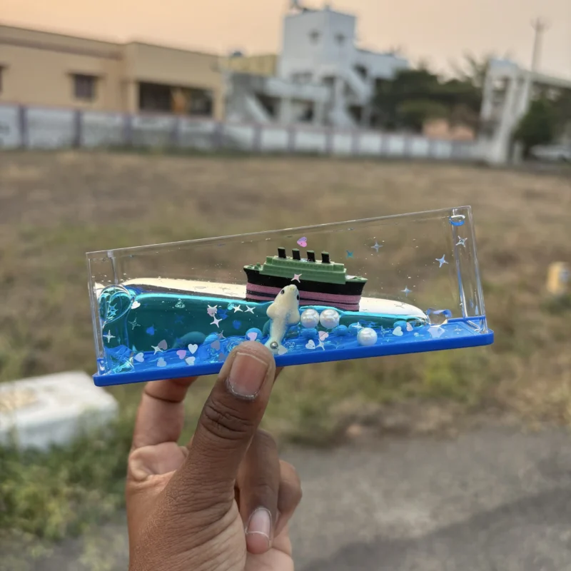 This Cruise Ship Fluid Drift Bottle is a captivating desktop ornament that brings the serene motion of the ocean to your workspace. Featuring a miniature cruise ship and iceberg floating in a vivid blue liquid, it uses the physics of buoyancy and fluid dynamics to simulate a ship gliding through waves.