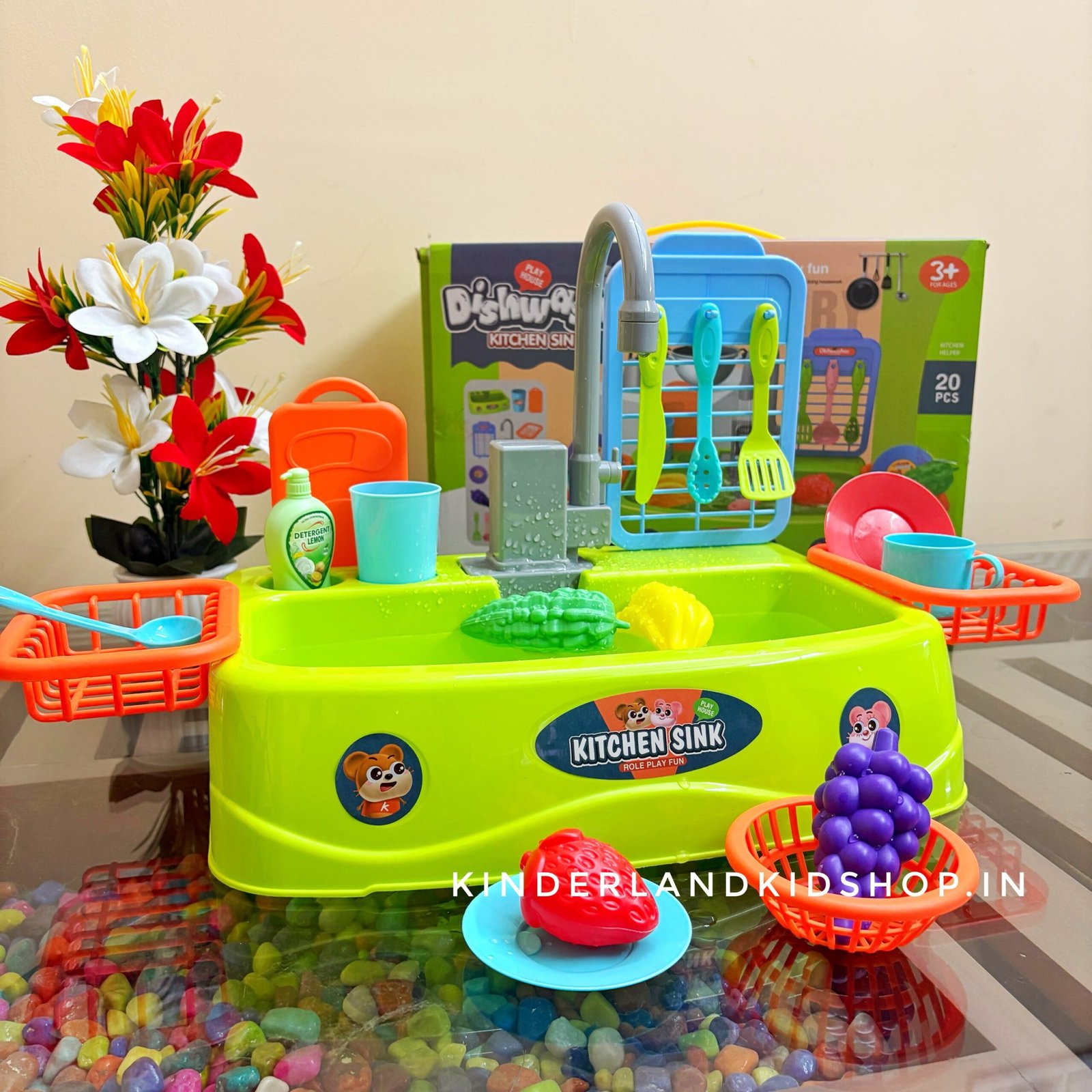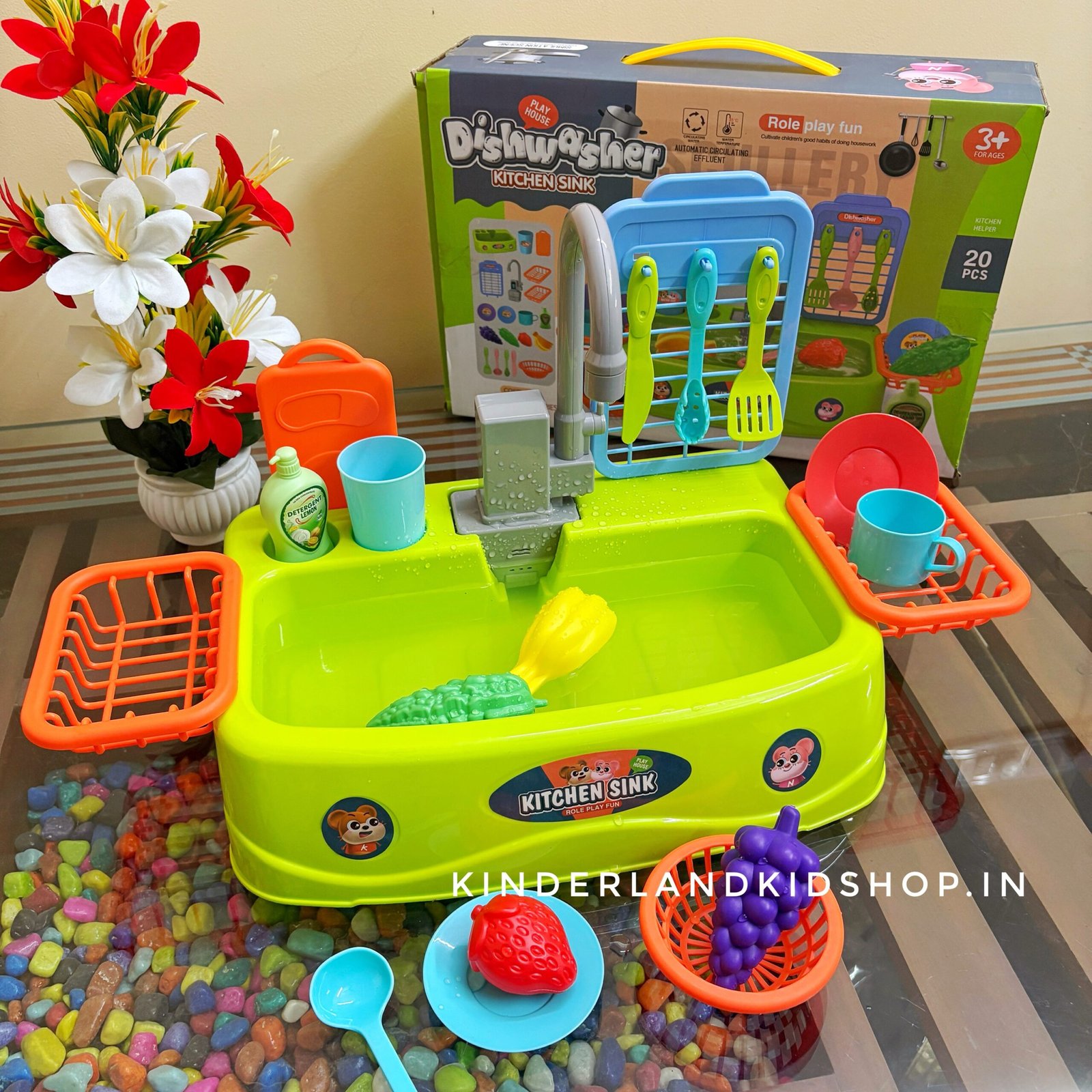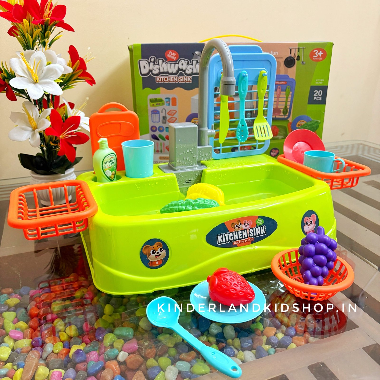 Encourage imaginative play with our toy dishwasher kitchen sink. Featuring a real running water faucet, colorful play food, and drying racks, it helps toddlers develop fine motor skills while “cleaning up” just like grown-ups. Shop the ultimate role-play toy today!