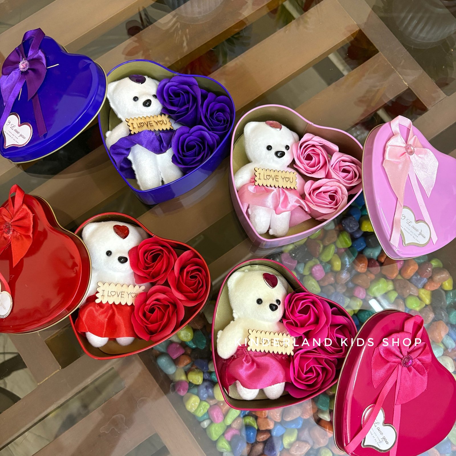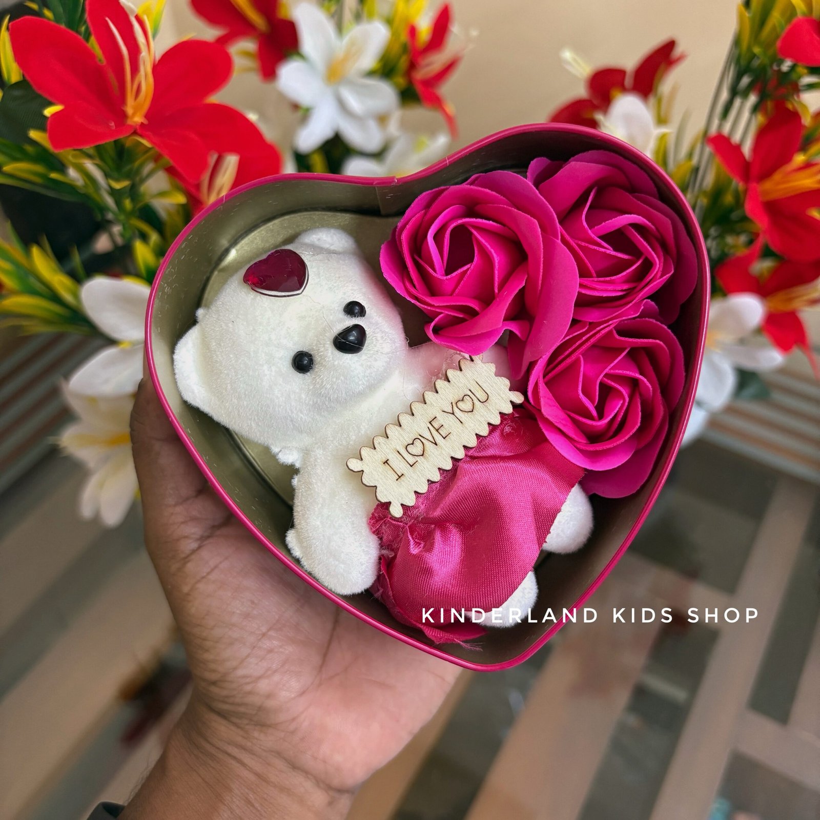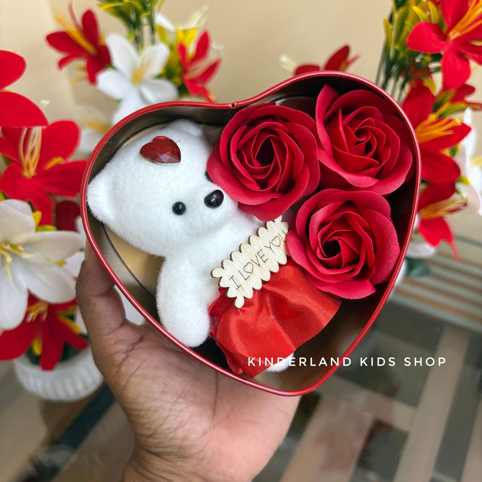 • What’s Inside: 1 Metal Heart Box, 1 Mini Teddy, and 3-6 Artificial Roses (set dependent).