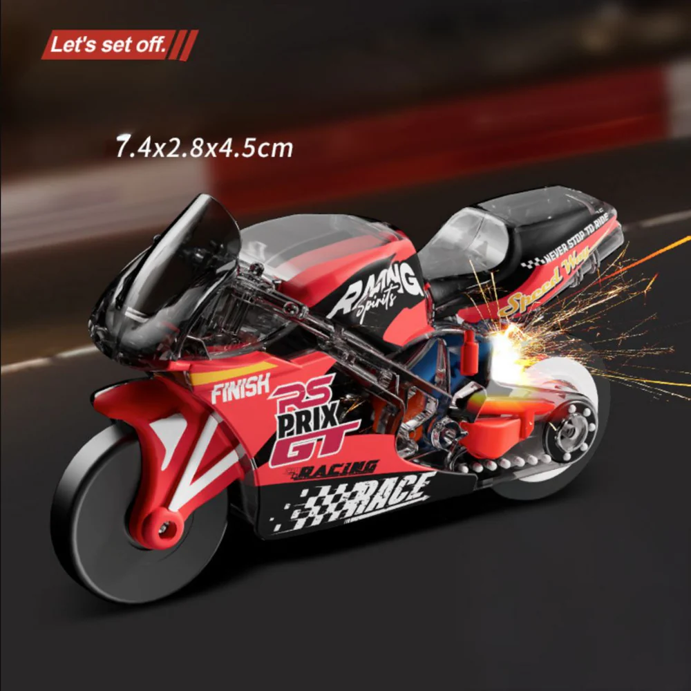 Ignite the excitement with the Mini Sparkling Fire Bike! This high-speed, pull-back racing toy features a realistic design and a built-in friction mechanism that creates real sparks as it zooms across the floor. Perfect for stunts, racing, and pocket-sized fun.