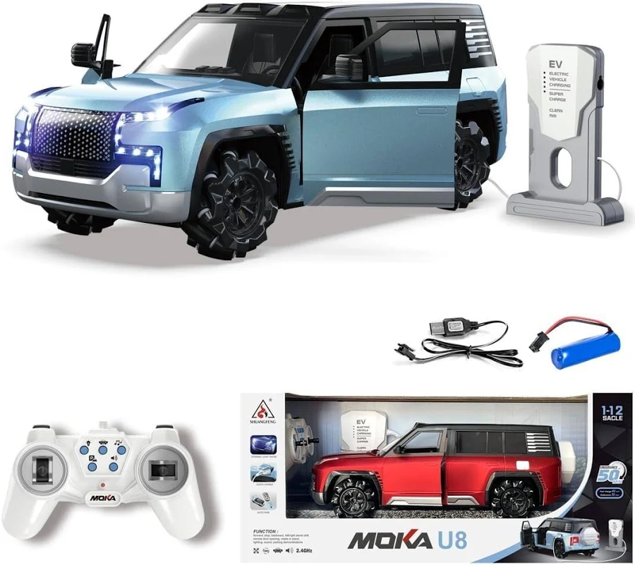 Take your racing to the next level with the MOKA U8 1:12 Scale RC SUV. This feature-packed electric vehicle combines futuristic design with interactive fun, featuring remote-controlled opening doors, lateral drifting, and a unique simulated EV charging station. With realistic LED headlights, built-in music, and a smart auto-park function, it’s the ultimate high-performance toy for kids and RC enthusiasts alike.