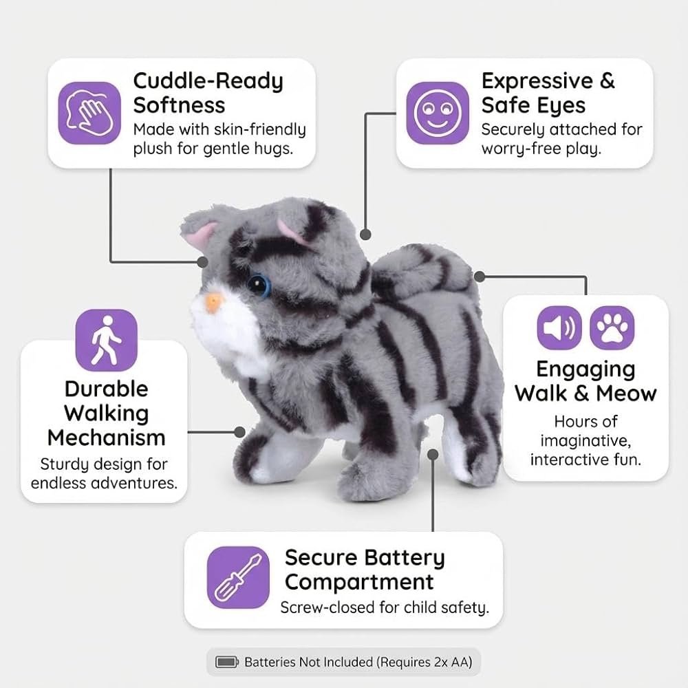 Interactive Motion & Sound: Features an engaging Walk & Meow mechanism that mimics a real kitten, encouraging active play and storytelling.