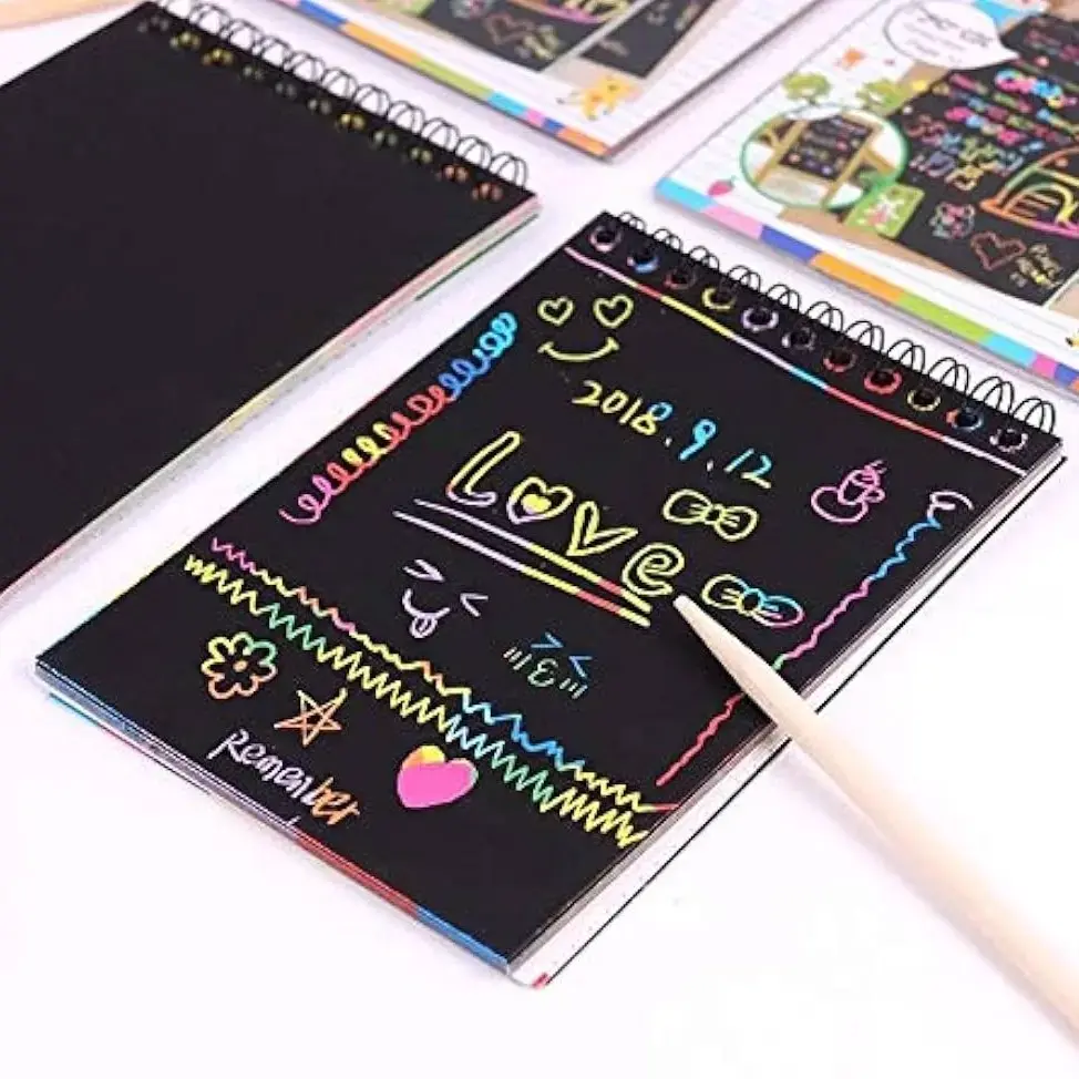 A creative tool often used by children. When the black surface is scratched away with a stylus, a colorful rainbow background is revealed.